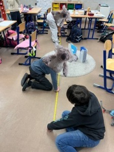 Nachdem der Zahlenraum bis zur Million erarbeitet worden war, traf die Klasse ihre erste Einschätzung. Jedes Kind verschob seine Bildkarte zu „Ja“ oder „Nein“ – ein kleines Stimmungsbarometer für eine Zahl, die kaum vorstellbar groß ist. Um der Sache auf den Grund zu gehen, machten sich die Kinder schließlich selbst an die Arbeit. Mit Zollstock, Maßband und viel Neugier maßen sie das Klassenzimmer eigenständig aus. Auch Kimi Koala wurde sorgfältig vermessen, damit eine realistische Berechnung möglich wurde. Im Unterricht lernten die Kinder dabei den Unterschied zwischen Quadratmetern, Quadratzentimetern und Kubikmetern, Kubikzentimetern kennen und übertrugen ihre Messwerte Schritt für Schritt in passende Formeln. Gemeinsam mit ihrer Lehrkraft Frau Brandl wurde alles ausgewertet und ausgerechnet – und bei dem Ergebnis staunte die Klasse nicht schlecht: Rund 91.390 Mal würde Kimi Koala in das gesamte Raumvolumen des Klassenzimmers passen. Würde man nur den Boden mit flauschigen Koalas auslegen, wären es etwa 4.422 Mal. Die Kinder waren überrascht, wie groß diese Zahlen sind und wie weit sie dennoch von einer Million entfernt bleiben.