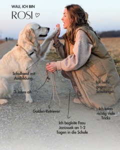Am 22. Oktober 2023 war der erste Termin der Schulhundausbildung von meiner Golden Retriever Dame „Rosi“, die 2-3 Mal pro Woche den Unterrichtsalltag meiner 4. Klasse begleitet. Der Förderverein der Anni-Pickert Schule übernimmt dankenswerterweise 50% der Kosten der nicht ganz günstigen Ausbildung zum Schulhund.